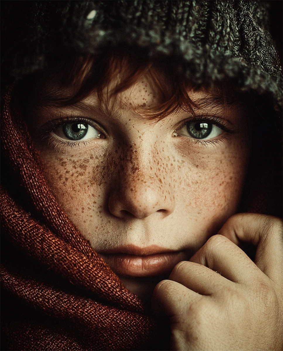 En los retratos de cerca, el trabajo se centra en el modelado de la luz y el tratamiento de texturas orgánicas, elevando el detalle hasta lograr un acabado de porcelana y grano pictórico.
